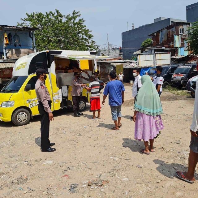 Jajaran Polsek Tanjung Duren Polres Metro Jakarta Barat membagikan makanan gratis kepada masyarakat yang terdampak wabah Covid-19 khusus nya di slum area di wilayah tanjung duren Jakarta barat