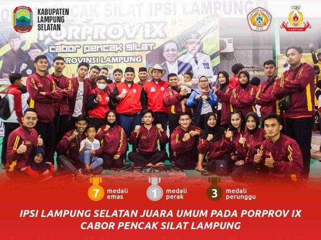 Pendekar IPSI Lamsel berhasil memboyong 7 medali Emas, 1 Perak, dan 3 Perunggu, serta sekaligus menobatkan Kabupaten Lampung Selatan sebagai Juara umum di Cabor Silat pada Pekan Olahraga Provinsi (Porprov) Lampung IX yang berakhir, Kamis (8/12/2022).