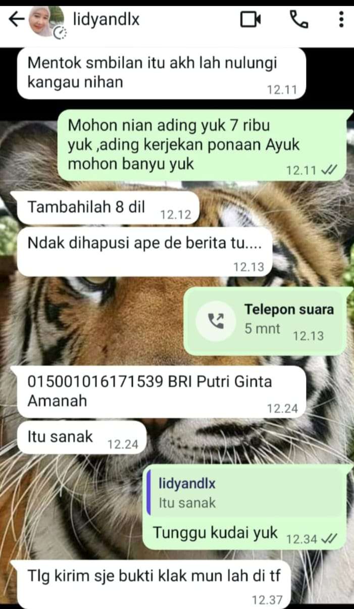Lalu pada hari Jum’at tanggal 6 September 2025 Lidya kembali menghubungi saya melalui Pesan WhatsApp. Pertama ia meminta uang sebesar Rp 9 juta kepada saya dengan memakai bahasa daerah Luk itulah mentok sembilan, itu aku lah nolongi kangau nihan tulisnya , lalu saya jawab bagaimana kalau 7 juta kemudian Lidya meminta ditambah satu juta lagi menjadi 8 juta, supaya berita tersebut dihapus dan tidak di share ke group- group WhatsApp. Lalu Lidya mengirim nomor rekening atas nama putri , Kemudian saya meminta agar Lidya mengirimkan nomor rekening atas nama dia pribadi kalau mau saya transfer , namun Lidya tidak mau mengirim nomor rekening pribadi mala yang dia kirimkan nomor rekening atas nama Putri Ginta Amanah atau orang lain.